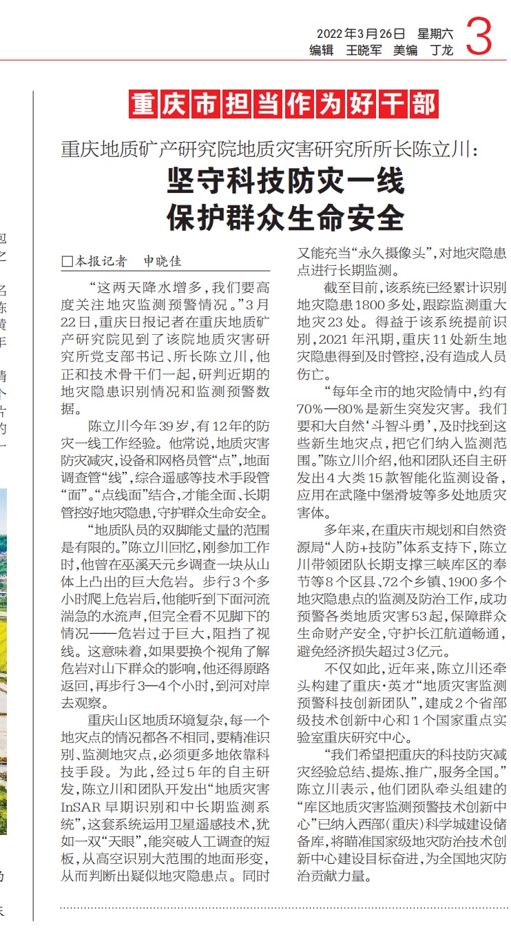 ——重庆市担当作为好干部:重庆地质矿产研究院地质灾害研究所所长陈立川